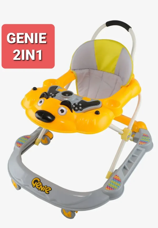 The Genie 2-in-1 Baby Walker combines playful design with functionality — featuring a fun animal-themed activity tray, cushioned seat, push handle, and convertible modes for a joyful and safe walking experience.