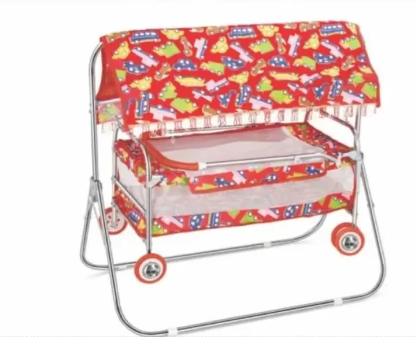 The NM-115 Baby Jhulla Baggi with Hood is crafted to provide maximum comfort, safety, and functionality for your baby. It features a vibrant printed fabric design with an overhead hood that provides shade and protection during naps. The strong 6-wheel metal frame ensures smooth movement and stability, while breathable mesh sides promote airflow. This cradle combines the convenience of portability with the gentle rocking motion of a swing. Ideal for newborns and infants, it’s easy to assemble and store.